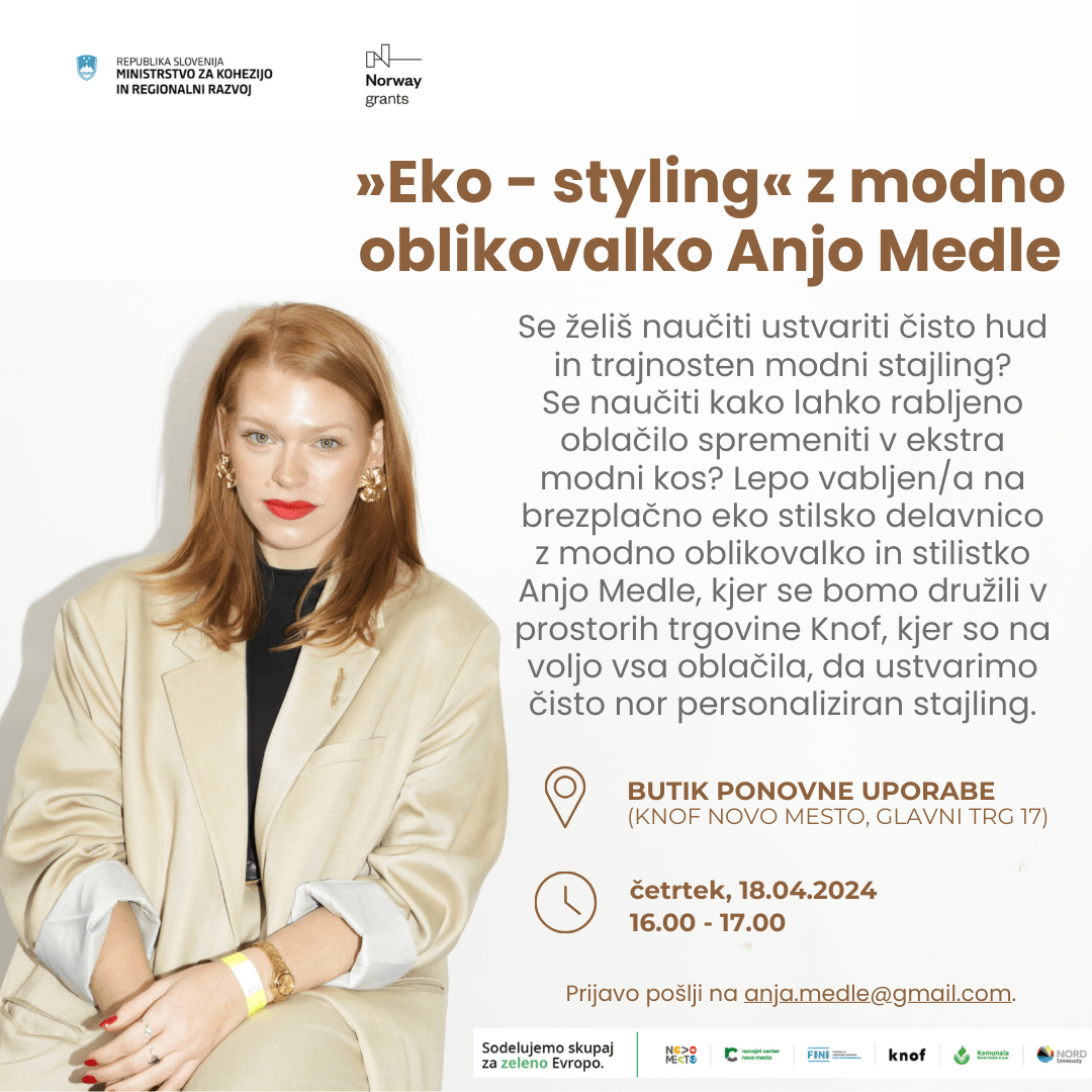 16.00 – 17.00 Delavnica »EKO-STYLING« z modno oblikovalno Anjo Medle. Se želiš naučiti ustvariti čisto hud in še trajnosten modni stajling? Se naučiti kako lahko rabljeno oz. zavrženo oblačilo spremeniti v čisto ekstra modni kos? Lepo vabljen/a na brezplačno eko stilsko delavnico z modno oblikovalko in stilistko Anjo Medle, kjer se bomo družili v prostorih trgovine Knof, kjer so na voljo vsa oblačila, da ustvarimo čisto nor personaliziran stajling za vsakega posebej. Prijavo pošlji na anja.medle@gmail.com, do 15. 4. 2024 oz. do zapolnitve mest.