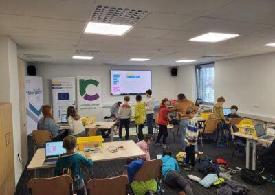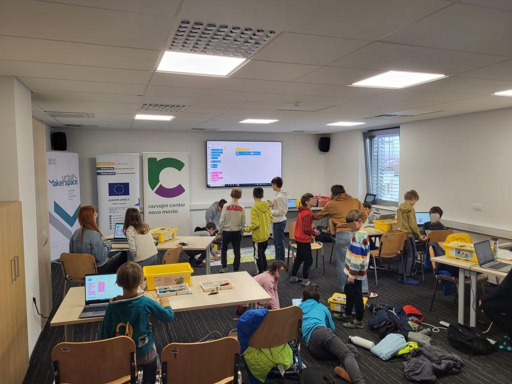 Informacijska točka EUROPE DIRECT Novo mesto je v četrtek, 29. februarja, organizirala počitniško delavnico robotike in zabavnega programiranja. Otroci so se pod vodstvom izurjenih mentorjev Razvojnega centra Novo mesto spoznali z robotki Lego Spike za začetnike, starejši pa so obnovili svoje znanje s programiranjem v Scratchu.
